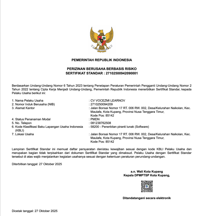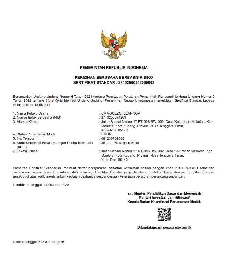 Didukung oleh tim profesional yang kompeten, Kami mengutamakan kualitas, kreativitas, dan relevansi dalam layanan yang ditawarkan. Kami percaya bahwa teknologi bukan sekadar alat bantu, tetapi juga katalisator perubahan dalam menciptakan ekosistem pembelajaran yang lebih inklusif, efektif, dan berkelanjutan. Melalui inovasi yang berkelanjutan, CV. Vocezmi LearNov berkomitmen menyajikan layanan literasi dan pembelajaran digital yang meningkatkan kompetensi, serta memperluas akses terhadap ilmu pengetahuan.